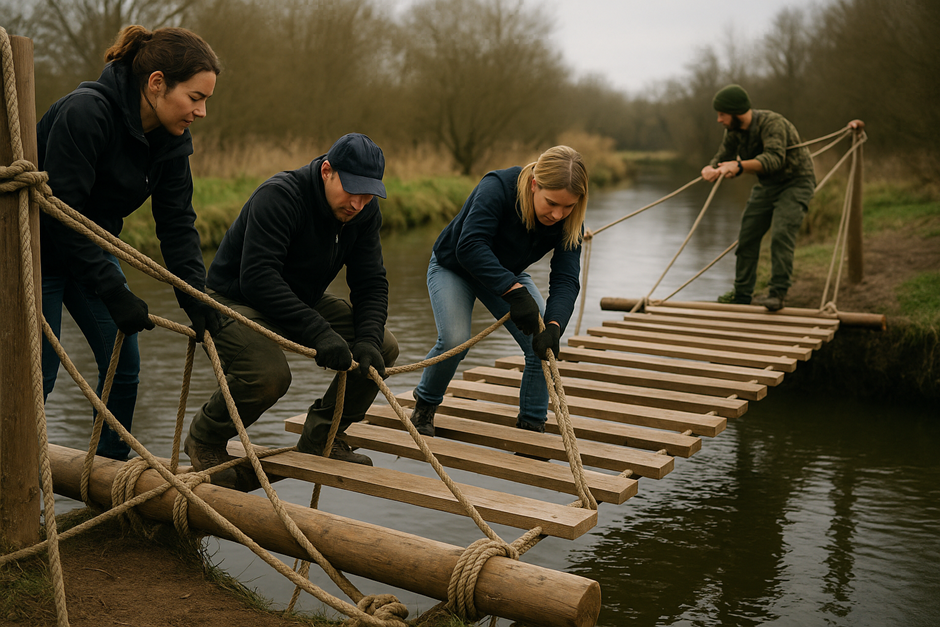 Daarna wees de instructeur één leider en één tijdsbewaker aan. Hij nam hen apart en raadde aan: binnen een minuut een besluit nemen, daarna bouwen. Zestien minuten later stonden ze wél aan de overkant.